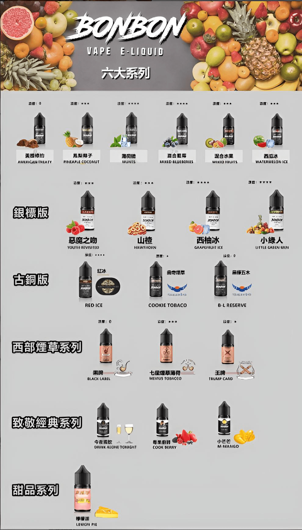 BONBON小煙油系列提供多種口味選擇,單瓶購買或混搭均可,享受多樣層次與穩定品質的最佳體驗。