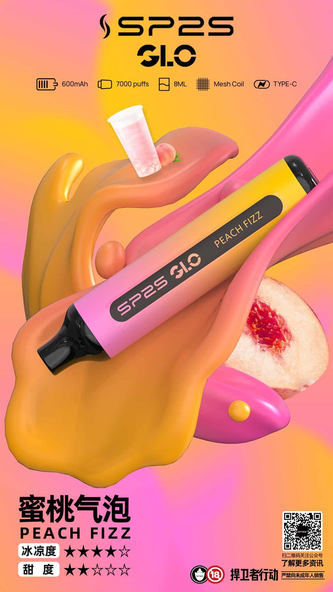 SP2S GLO 7000口一次性煙桿搭載8mL特大煙油與600mAh高效電池,單支約可提供7000口順滑霧化體驗,專為長時間使用與高頻通勤族設計。全系列擁有約15種風味,涵蓋水果、冰爽、茶飲與特色飲品多種口感,結合升級雙芯霧化技術與密封防漏結構,煙霧細膩飽滿、層次分明,外出攜帶更安心,讓你隨時隨地暢享清爽霧感。